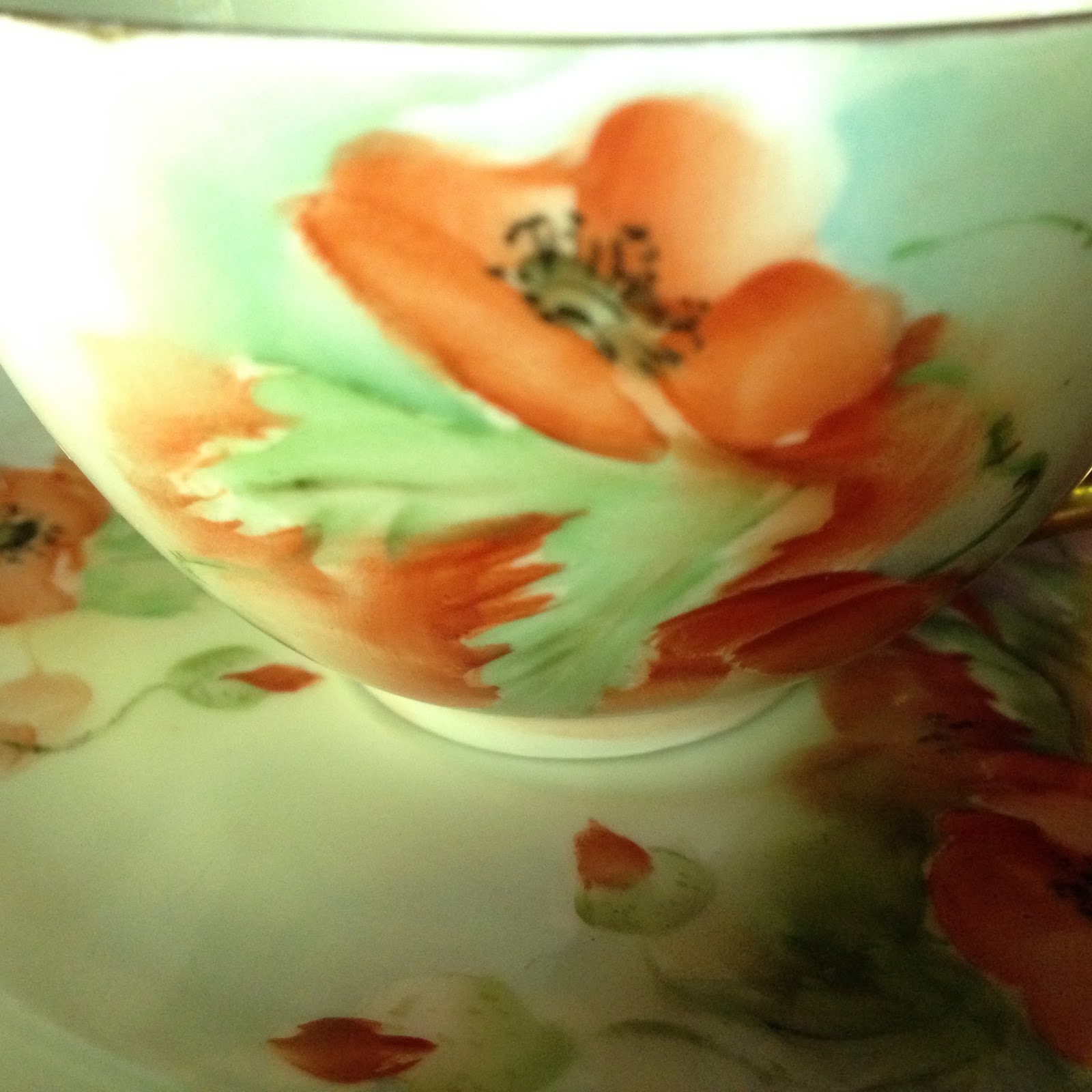 I had to drop off some items at the Goodwill and so I popped in to see if there was anything interesting. I was good, but did find this really pretty poppy teacup and saucer. It is hand painted, but I couldn't find a signature. It's so pretty and just looked like fall.